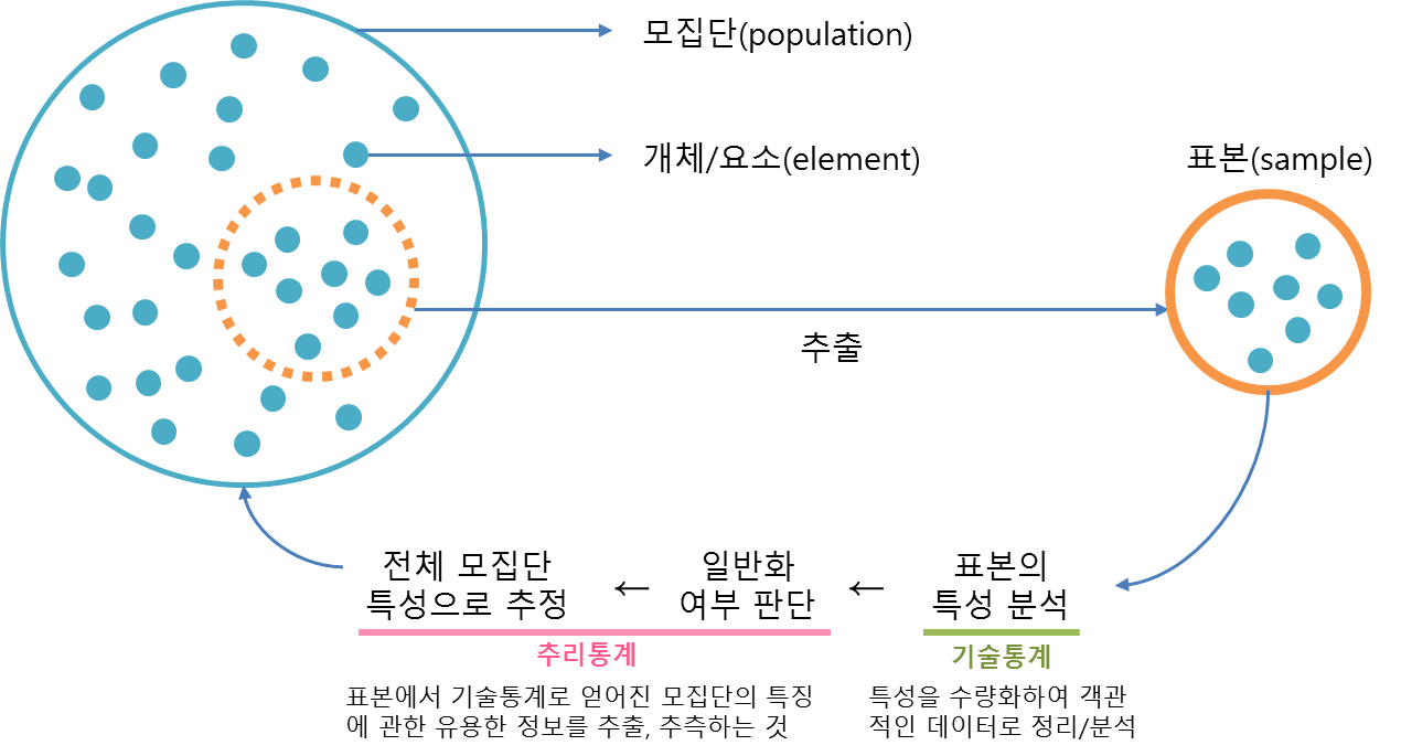 - 통계는 데이터를 다루는 목적에 따라 크게 두 가지(기술통계 / 추리통계)로 분류로 나눌 수 있다.